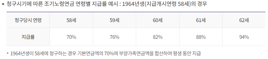 앞서 설명드린 64년생의 경우 조기 노령연금 지급개시 나이가 58세입니다. 청구당시 나이가 58세라면 1년에 6%씩 감액하여 총 5년 동안 30%가 감액된 70%를 58세부터 평생 수령하시게 됩니다.