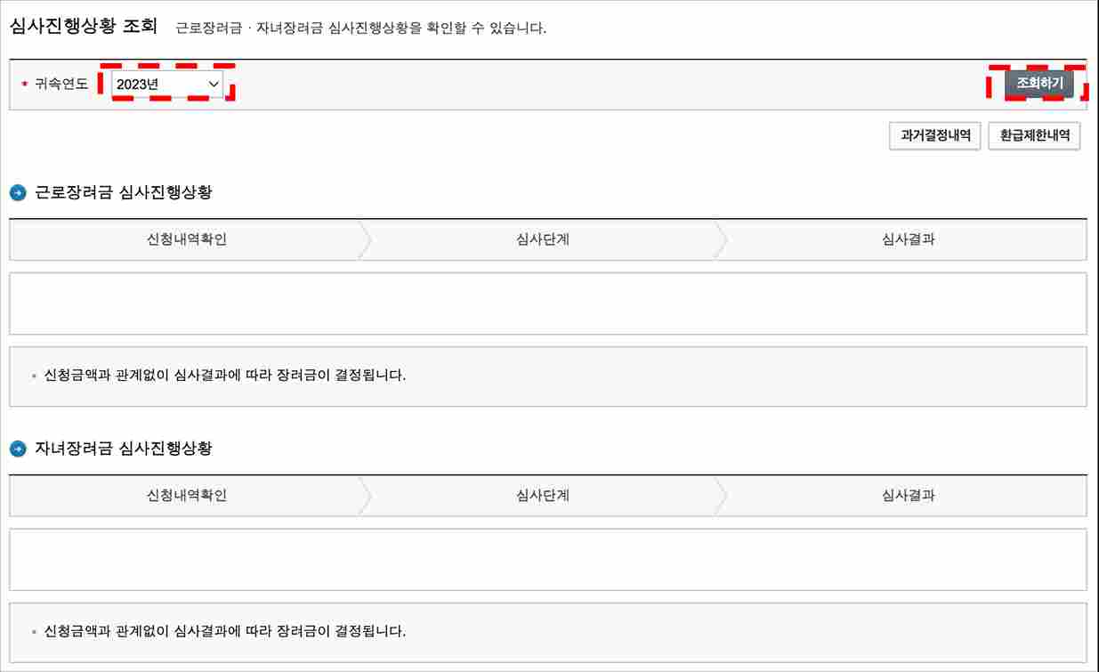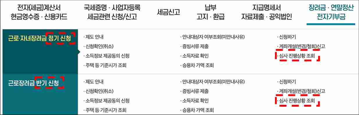 - 홈택스 홈페이지 > 장려금·연말정산 전자기부금 > 근로·자녀 장려금 정기신청(반기신청) > 심사진행상황 조회