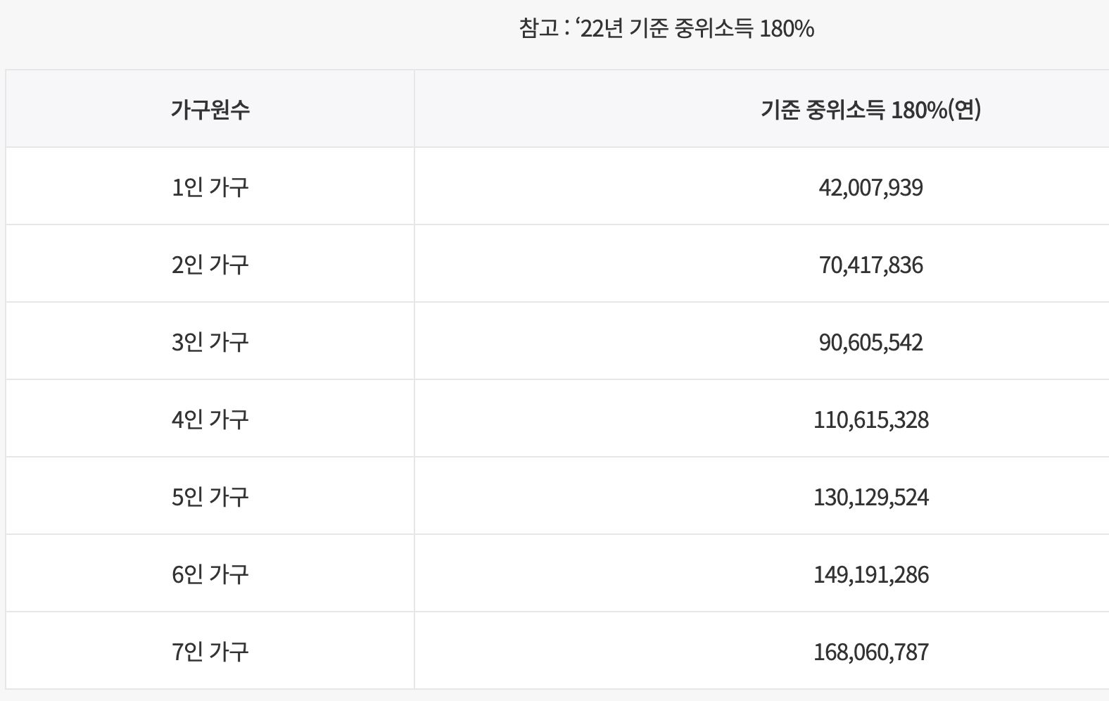 - 가구원수에 따른 기준 중위소득이 180% 이하에 해당하는 자