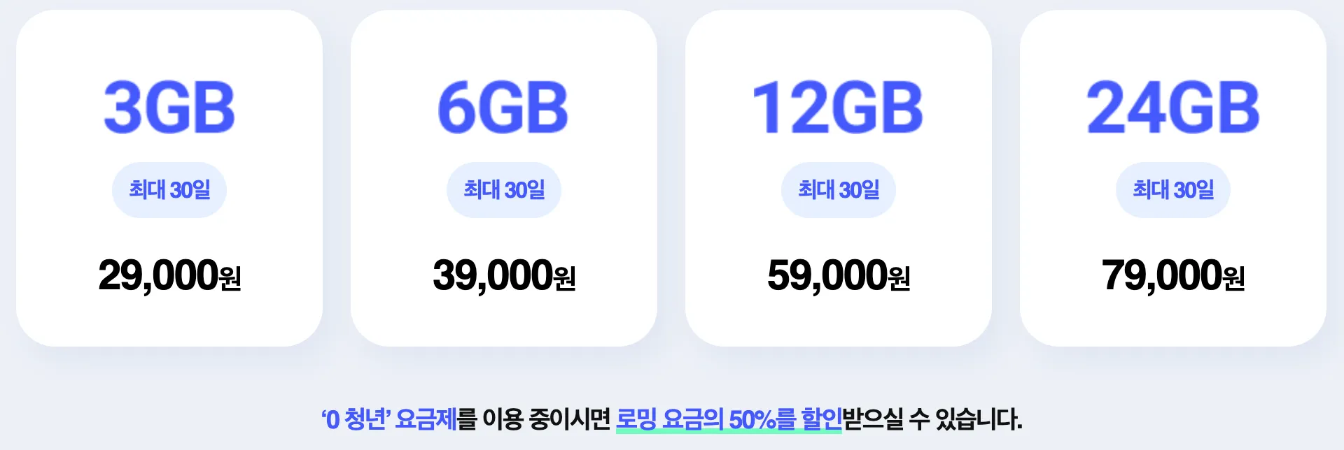 0청년요금제를 이용하면 로밍 요금의 50%를 할인받을 수 있습니다. 아래 그림에 보이는 가격의 절반만 내시면 됩니다.
